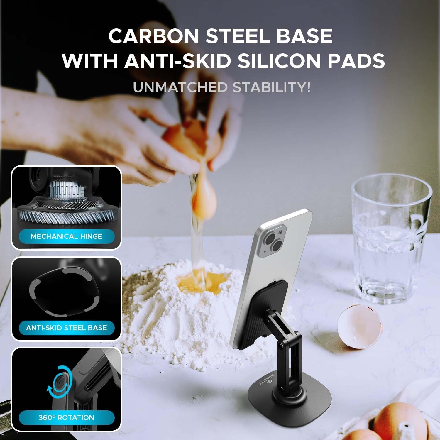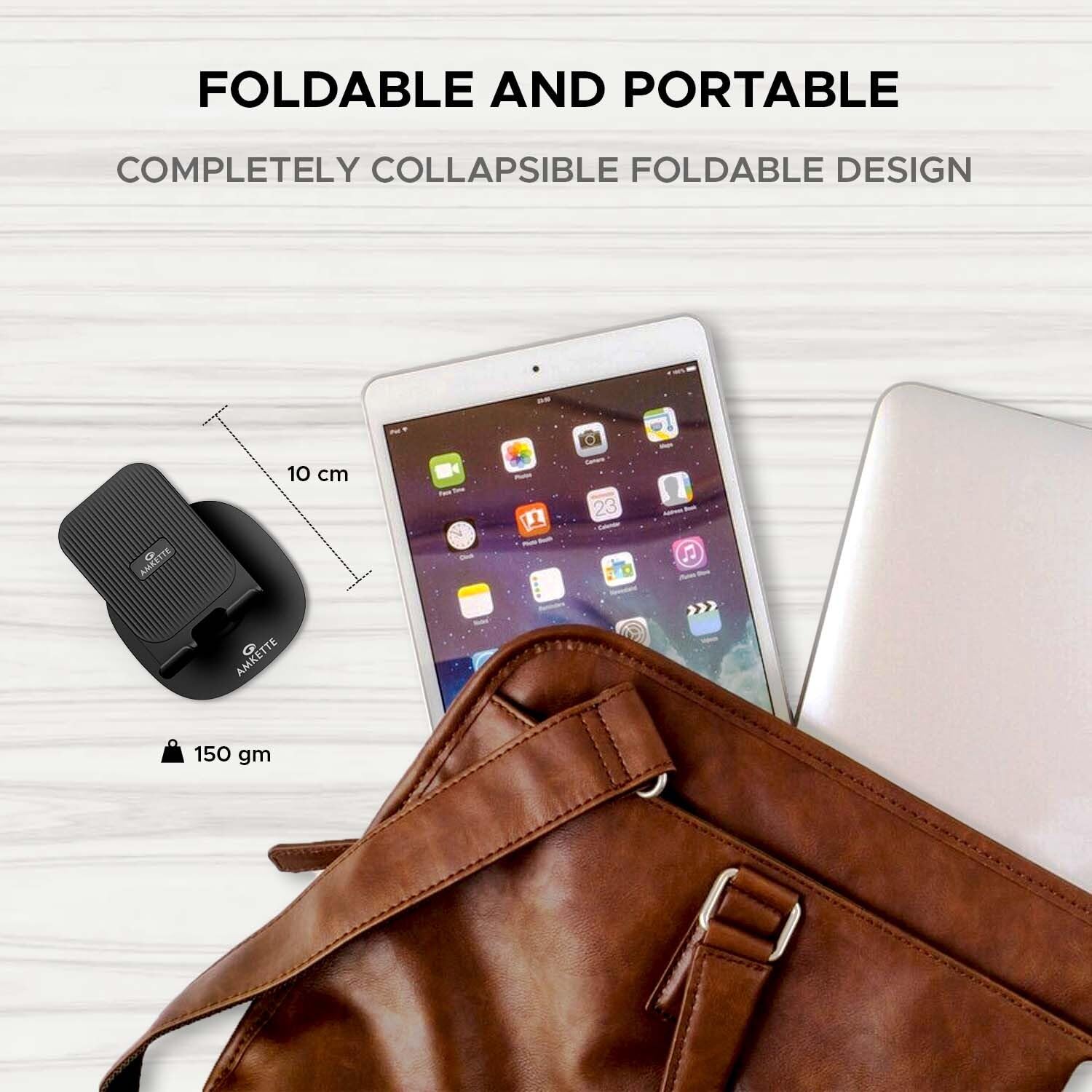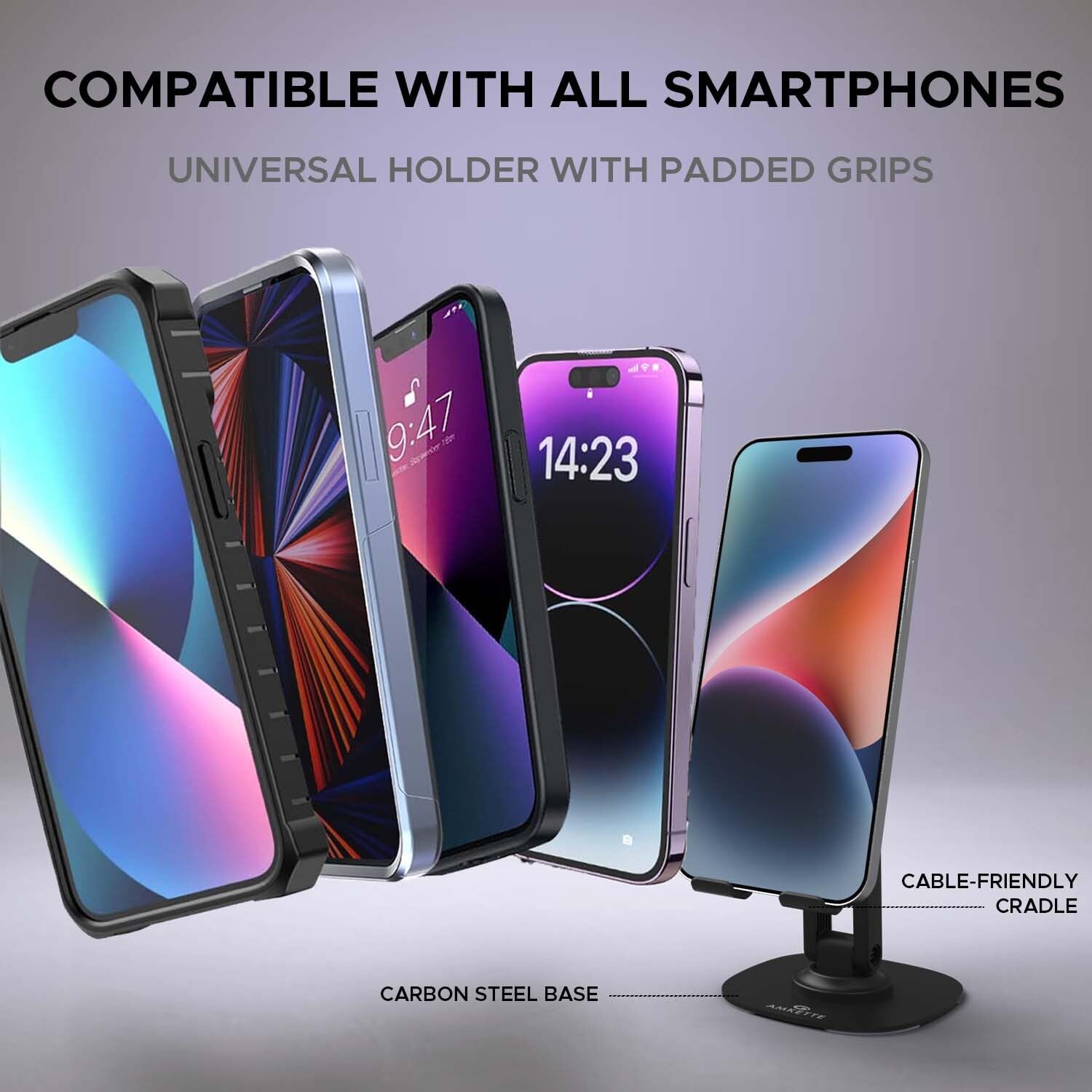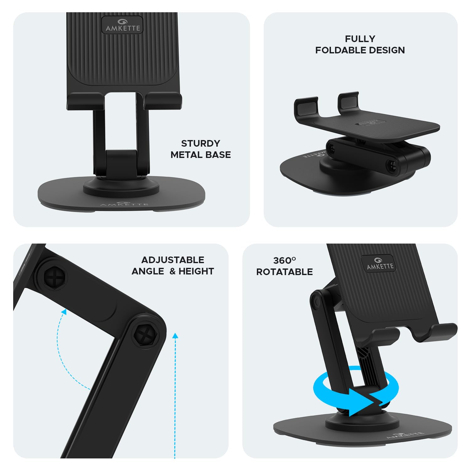 Amkette Ergo 360° Rotation Mobile Phone Holder, Foldable Design Mobile Stand with Stable Metallic Round Base, Multiple Height & Angle adjustments for Smartphones, Tablets, Kindles & iPad, (Black)