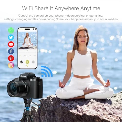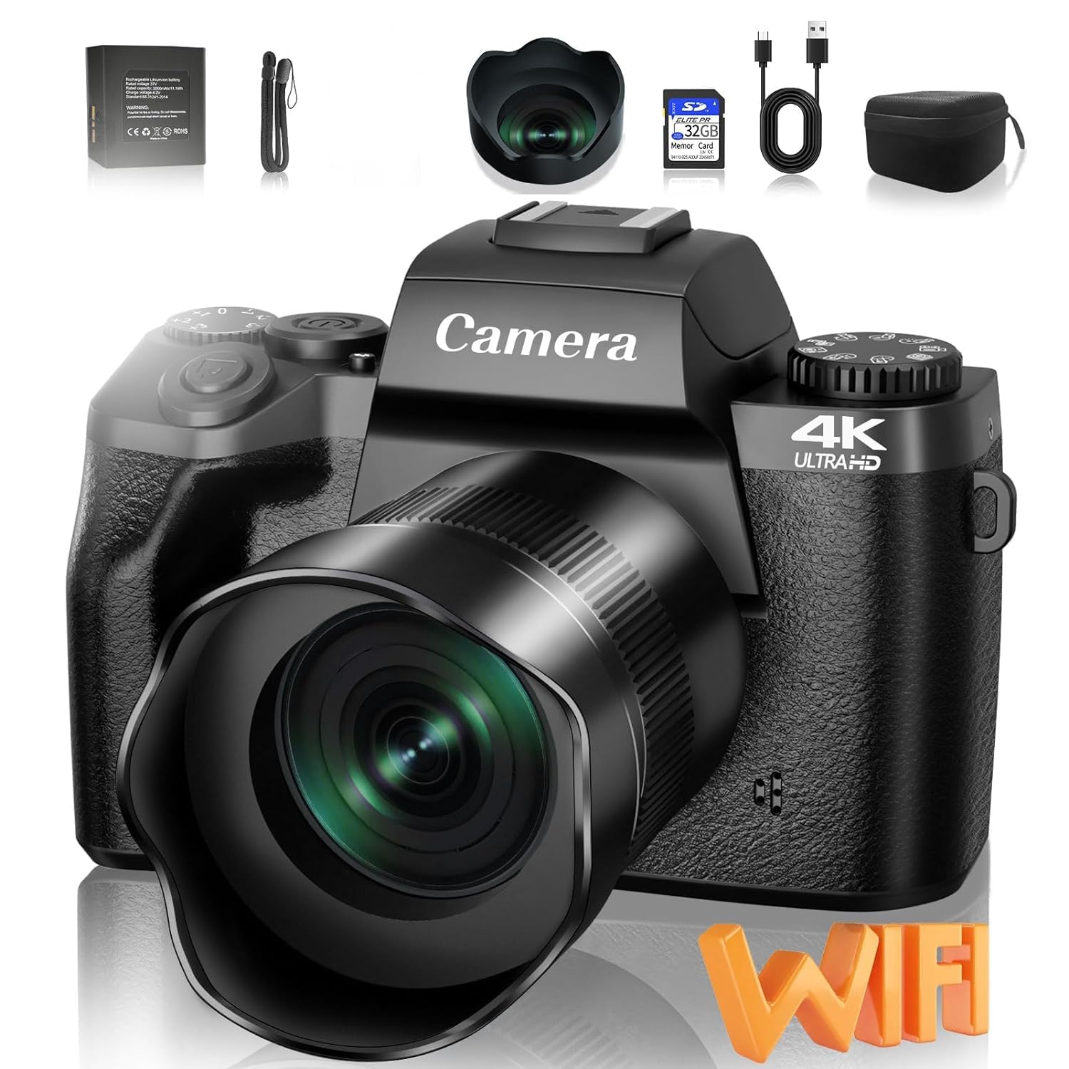 Digital Camera for Photography, 64MP WiFi Touch Screen Vlogging Camera with Flash, 4K + 32GB SD Card, 3000mAH Battery Lens Hood, 4″Big Screen, Hot Shoe Interface Front and Rear Cameras (Black)