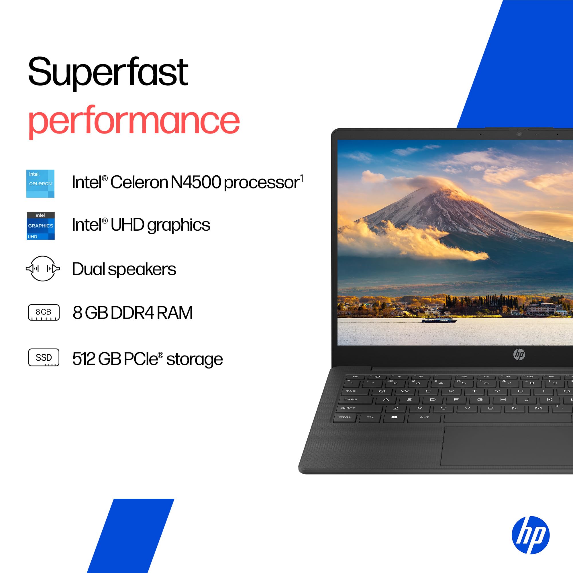 - Processor – Intel Celeron N4500 (up to 2.8 GHz burst frequency, 4 MB L3 cache, 2 cores, 2 threads) ; Memory – 8GB DDR4-2933 MT/s (1 x 8 GB); Storage -512 GB PCIe NVMe M.2 SSD