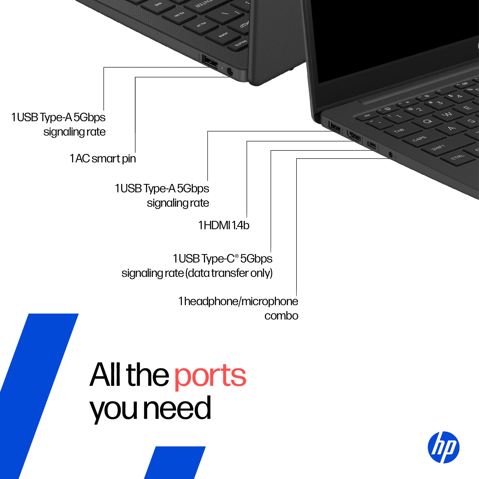 - Ports – 1 USB Type-C 5Gbps signaling rate (supports data transfer only and does not support charging or external monitors); 2 USB Type-A 5Gbps signaling rate; 1 AC smart pin; 1 HDMI 1.4b; 1 headphone/microphone combo|