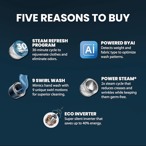 - Key Features: AI Technology, Eco Inverter Motor, Power Steam Cycle For Power Cleaning, Aqua Energie Device For Water Softening, Better Detergent Action & Color Protection, Cradle Wash For Delicates, Time Saver: Saves Water, 9 Swirl, Laundry Add, Quick Express Wash