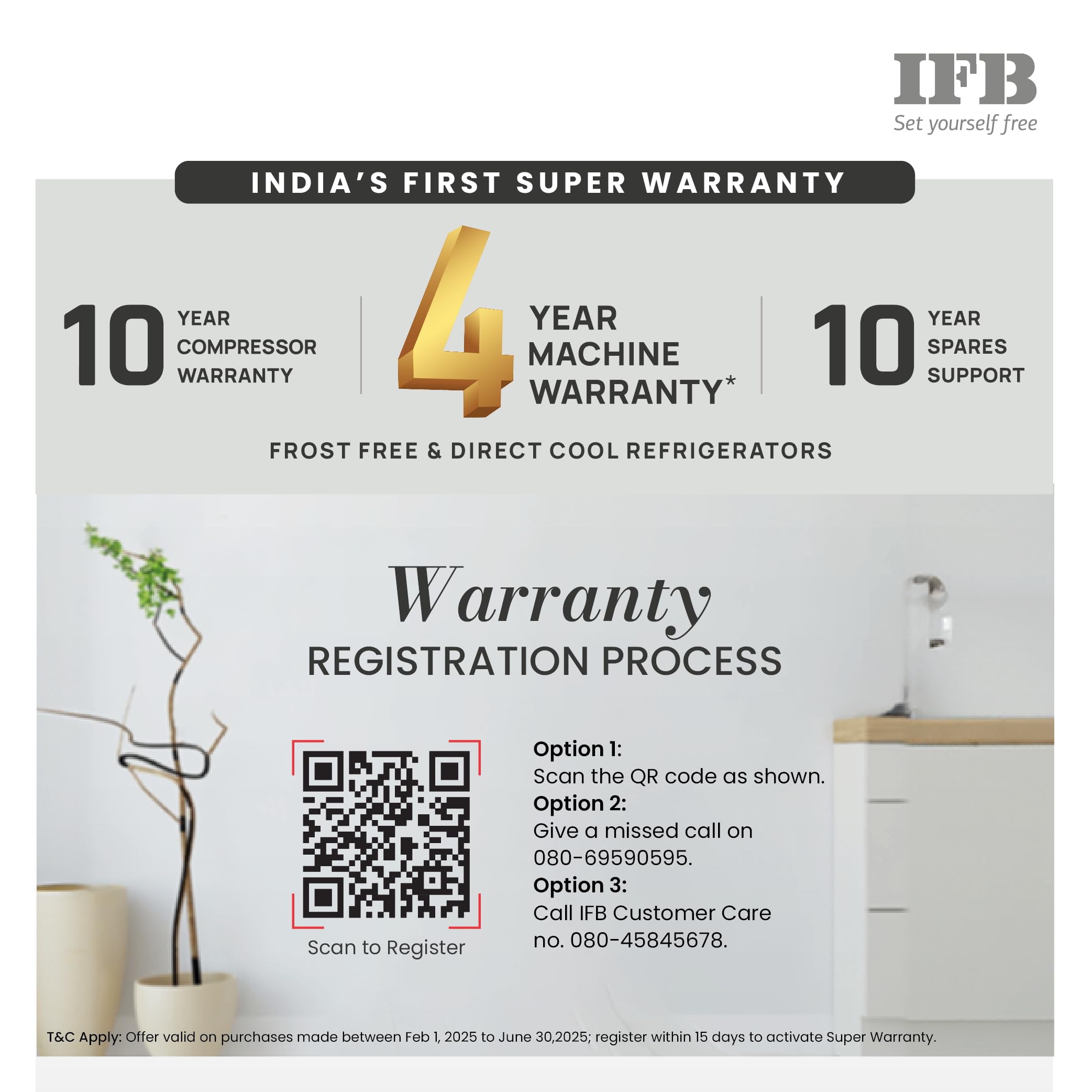- IFB Super Warranty: India’s First & Only! Enjoy 4 years of machine warranty, 10 years of compressor warranty, and 10 years of spare parts support.