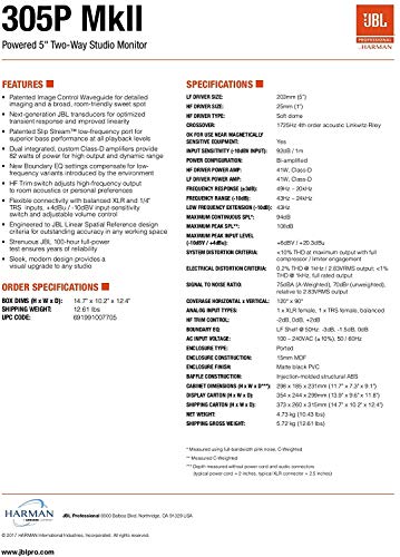 Details: JBL 305P MkII active studio monitors are a great nearfield solution for any serious audio engineer or music producer. They’re great for mixing music in your DAW software, editing video, or any other task that requires monitoring accuracy. JBL designed the 305P MkII with advanced features acquired from their 7 Series and M2 Master Reference Monitor, making legendary JBL performance accessible to every studio. JBL’s innovative Image Control Waveguide works in concert with refined transducers to deliver a well-defined and incredibly dimensional stereo image. Ask anyone : from surprisingly rich lows to smooth highs, you’ll find it easy to produce great-sounding recordings with JBL 305P MkII studio monitors.
