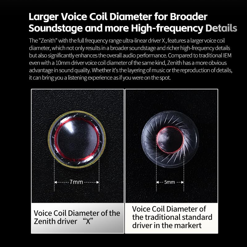 - 【ULTRA-MICRO MAGNETIC GAP AND HIGH SENSITIVITY】 With an ultra-micro magnetic gap 0.15mm, KZ Zenith HiFi earphones is superior in the IEM earphones market. It makes KZ Zenith buds easier to drive, the magnetic field is stable, higher cost but lower distortion. The increase in sensitivity enables more precise presentation of subtle and delicate sound,improving the transient response and frequency range. It greatly reduces the demand for the front-end equipment of the KZ Zenith headphones.