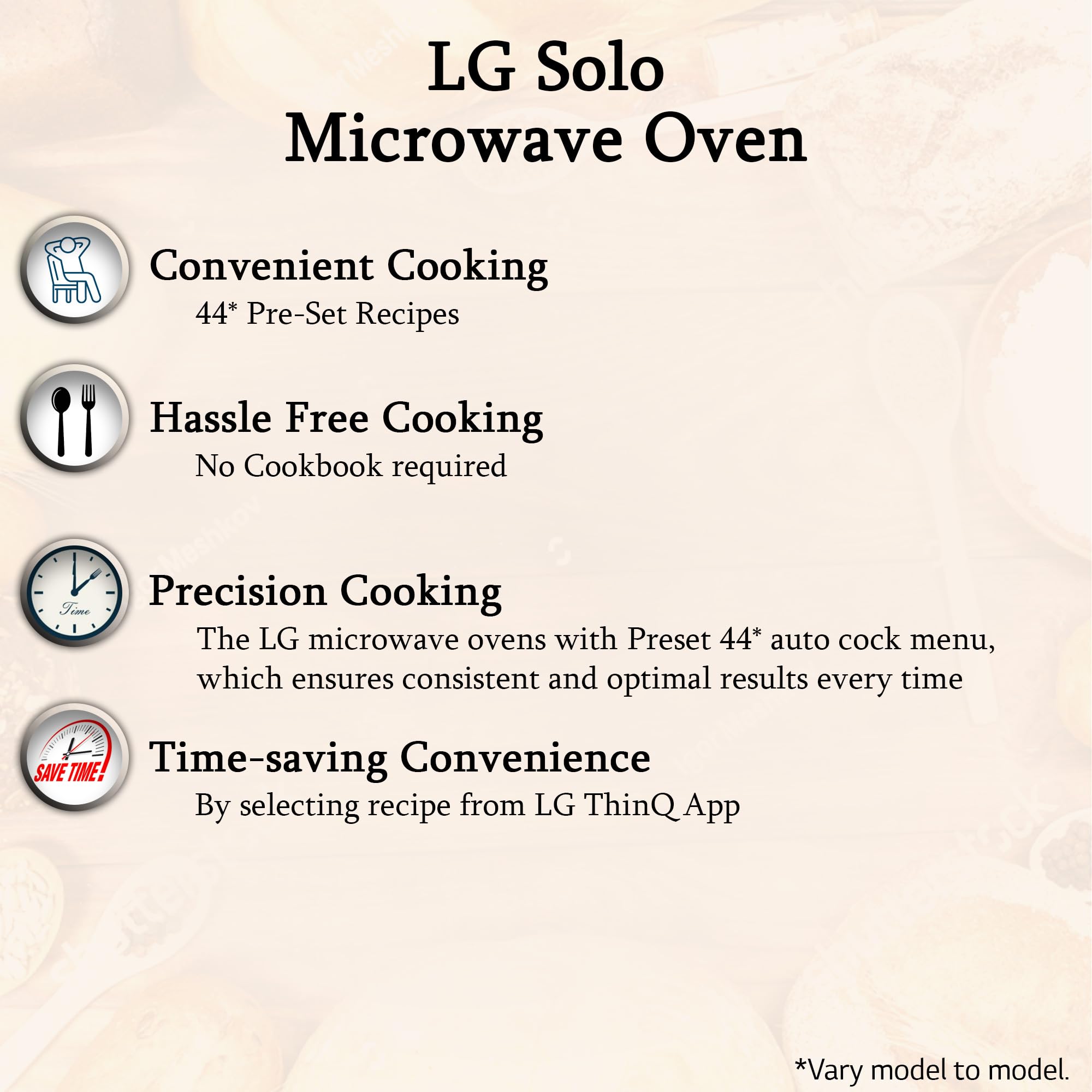- Special Features: i-wave – This patented technology ensure faster and healthier cooking by circulating microwaves evenly inside the cavity | Anti Bacteria Cavity – reduces bacteria growth inside the cavity | Steam Clean – Steam Clean – Wiping the microwave cavity absolutely clean | Energy Saving