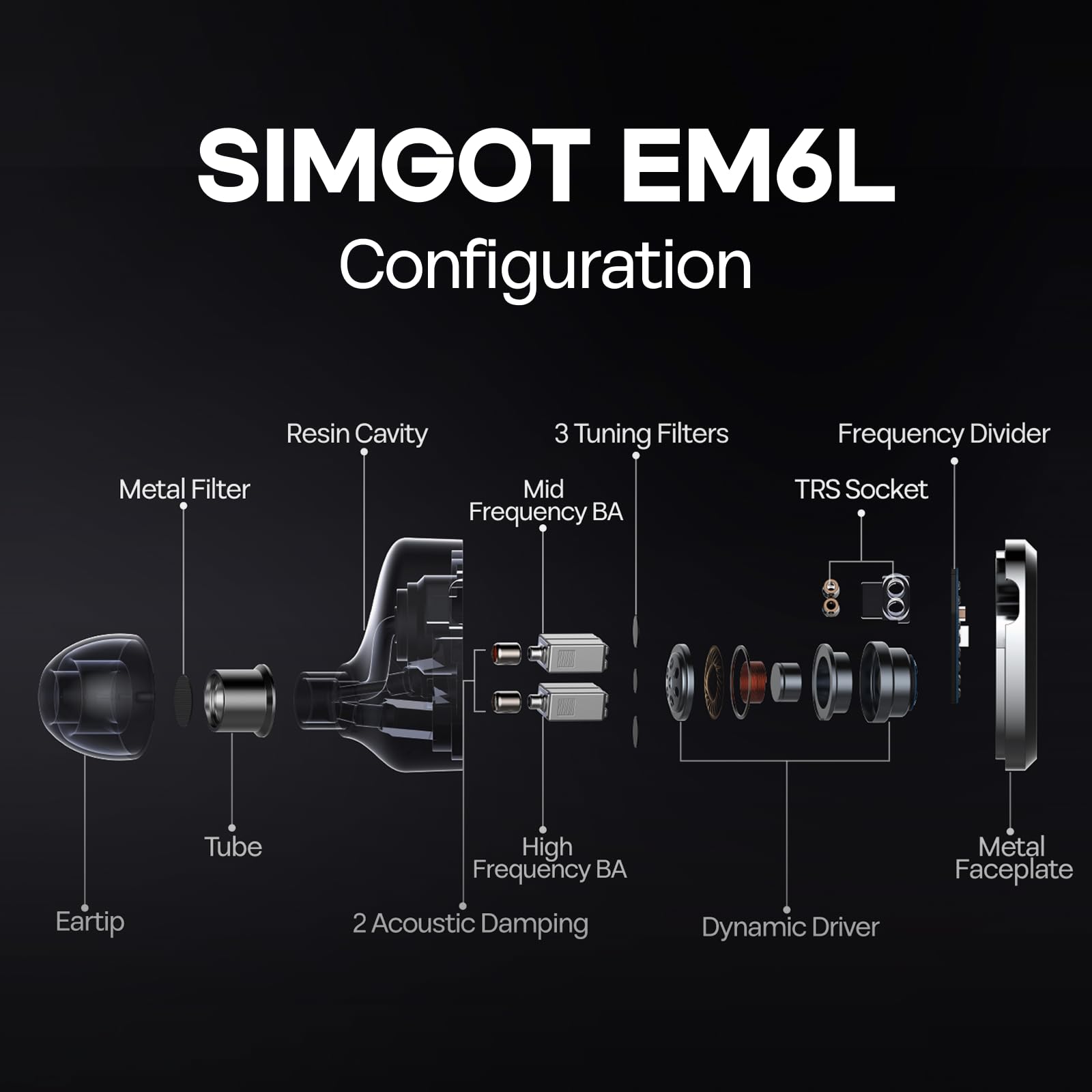 - 【𝟏𝐃𝐃 + 𝟒𝐁𝐀 𝐇𝐲𝐛𝐫𝐢𝐝 𝐃𝐫𝐢𝐯𝐞𝐫𝐬】Developed upon the legacy of its predecessor, the EM5, SIMGOT EM6L takes audio excellence to new heights. EM6L combines an 8mm custom-designed high-polymer diaphragm dual-cavity dynamic driver to handle the mesmerizing mid-to-low frequencies. Alongside, two sets of balanced armature drivers take charge of the mid-to-high and high frequencies. With meticulously set crossover points and precise tuning techniques, we not only achieve seamless frequency response and phase coherence but also achieve a harmonious blending of tones.