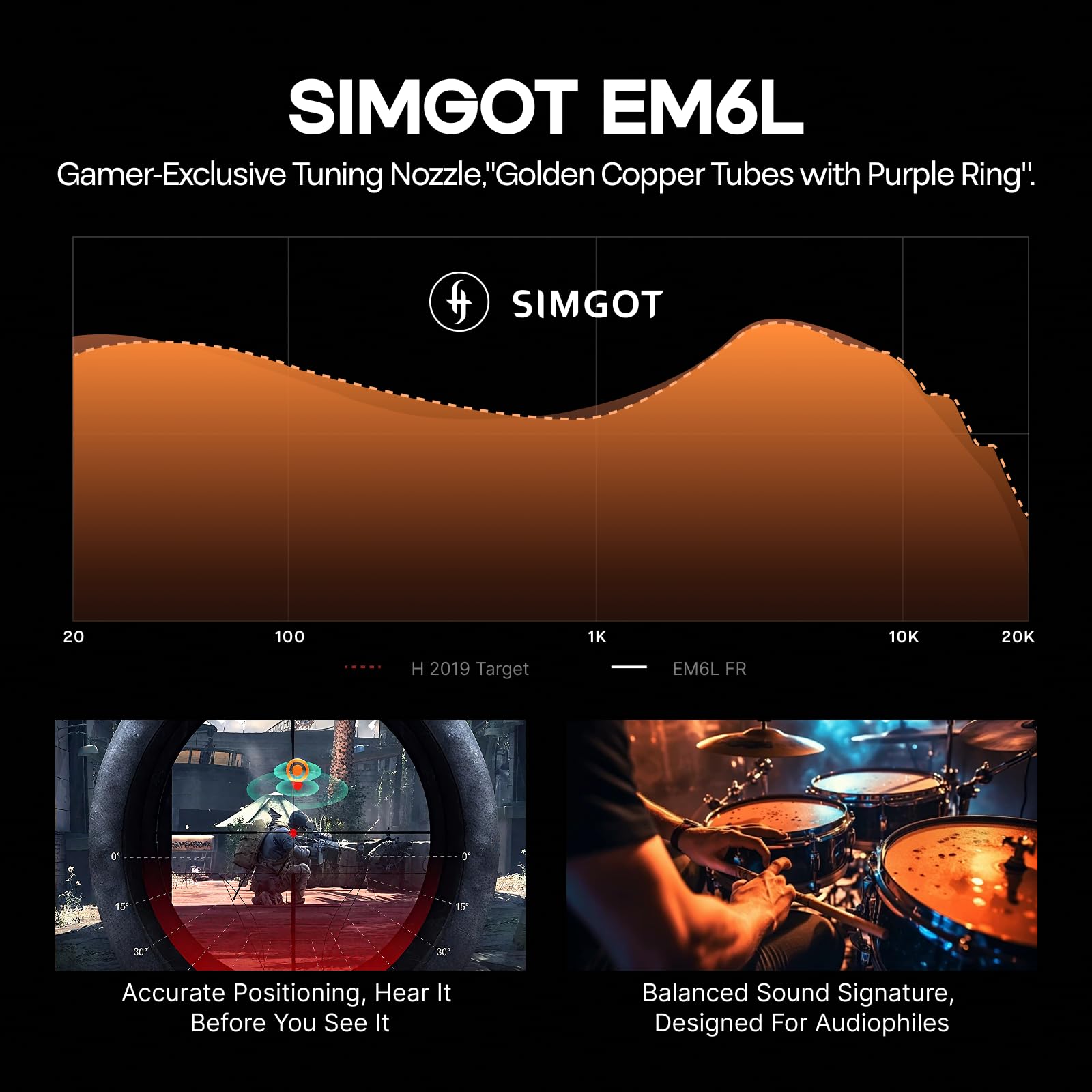 - 【𝐇𝐢𝐅𝐢 𝐄𝐚𝐫𝐛𝐮𝐝𝐬 𝐟𝐨𝐫 𝐆𝐚𝐦𝐢𝐧𝐠】Unlock audio and gaming perfection with our versatile SIMGOT EM6L earbuds. Tuned to the H-2019 curve, SIMGOT EM6L flawlessly reproduce audio with accurate soundstage positioning and imaging, excelling in both gaming and music playback. Dynamic low-frequency response ensures precise positioning, while spatial sound effects create an immersive experience. With outstanding noise isolation, enjoy a private cinema-like audio adventure. Gain a competitive edge and elevate your gaming with our extraordinary headphones. Redefine excellence in 3D audio bliss.