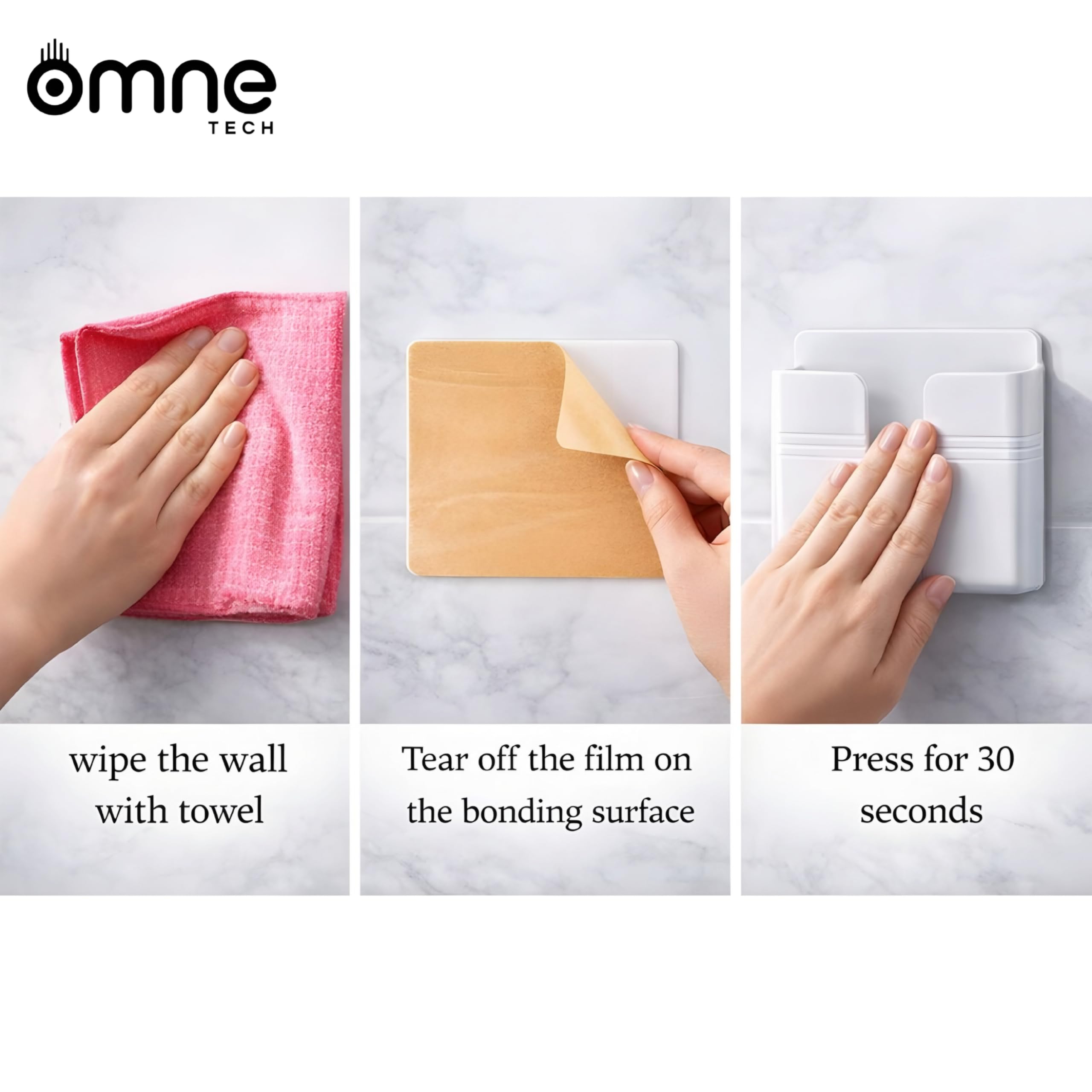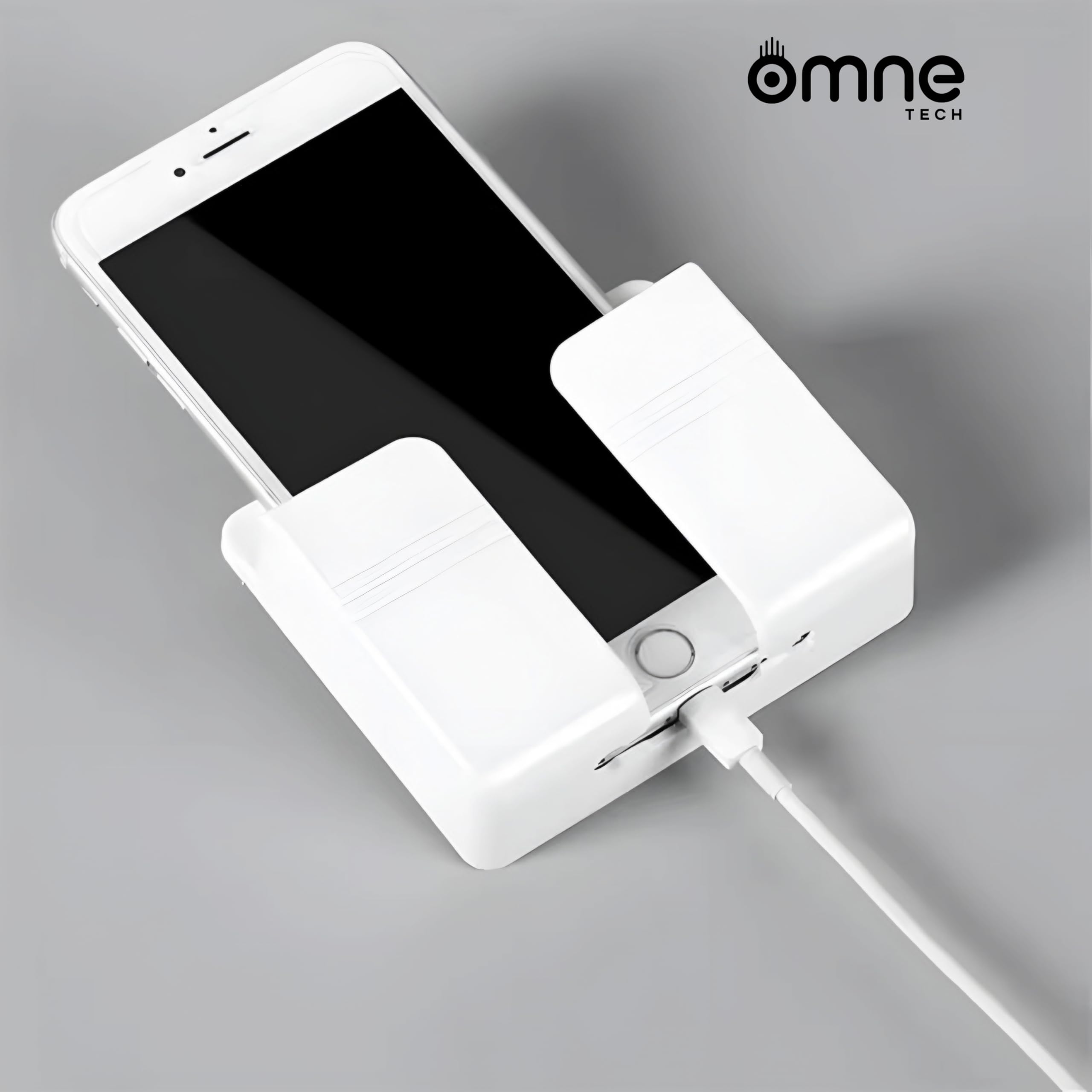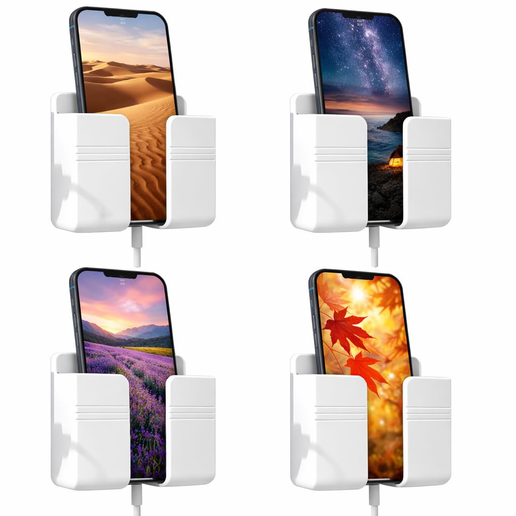 omne TECH Wall Mount Mobile Holder with Charging Support & Dual Hooks | Pack of 4 Phone Stands for Bathroom, Kitchen, Bedroom | ABS Plastic