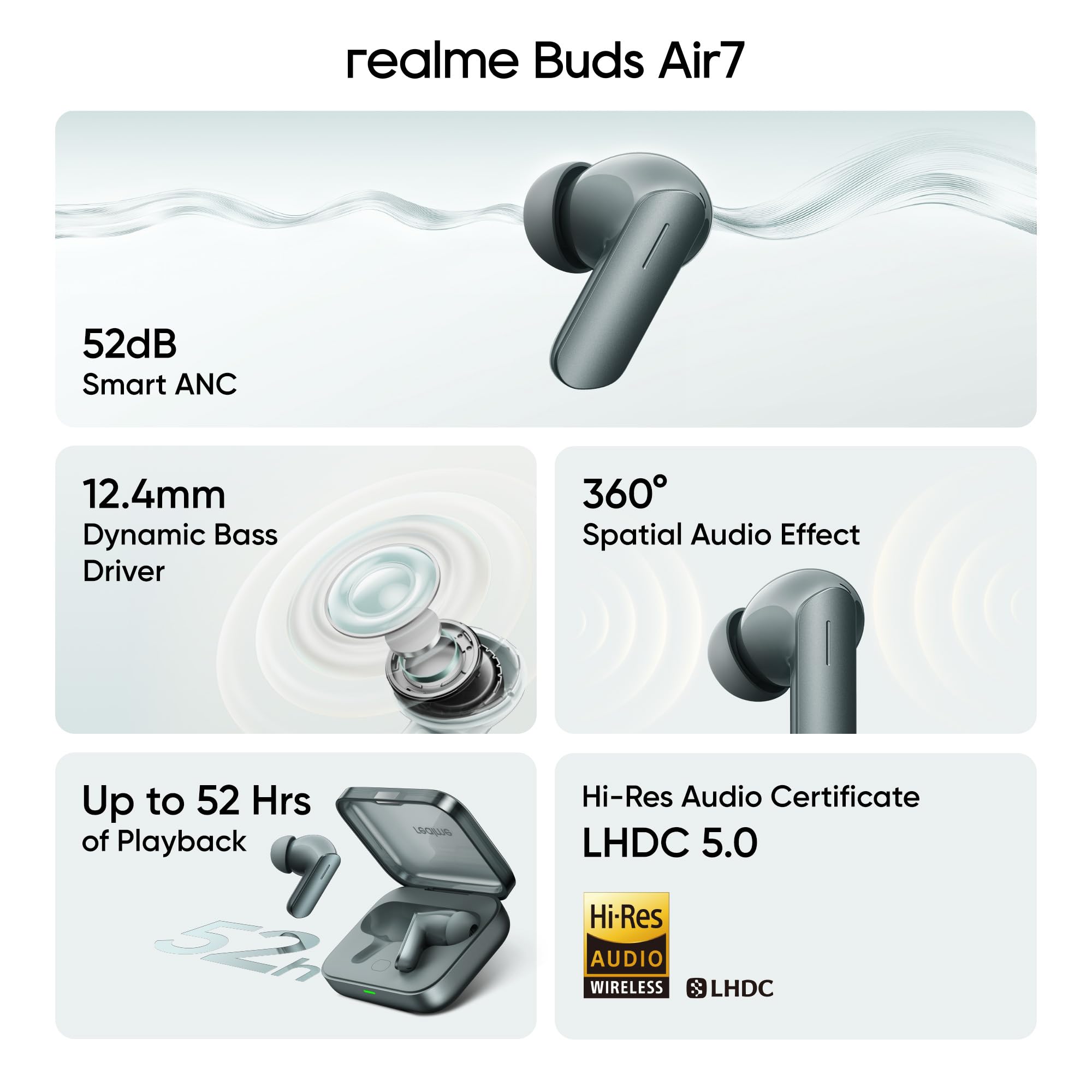 realme Buds Air 7,12.4mm Dynamic Bass Drivers,52Hrs Playtime,52dB Hybrid ANC,6 Mic ENC,45ms Low Latency,360° Spatial Audio,Hi-Res LHDC,IP55 Dust & Water Resistant,True Wireless TWS BT v5.4(Moss Green)