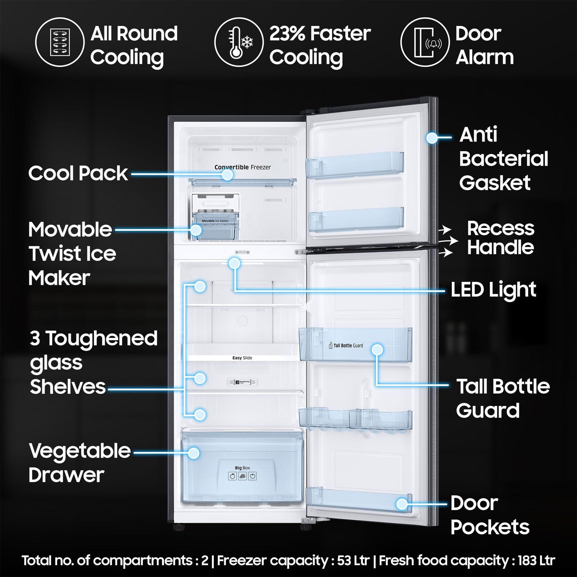 - Interior Description : Fresh Food Capacity : 183 Ltr | Freezer Capacity : 53 Ltr | Total no. of compartments : 2 | Shelves : 2 | Vegetable Drawers : 1 | Shelf Type : Toughened Glass Shelves | Anti Bacterial Gasket | Temperature Control : External