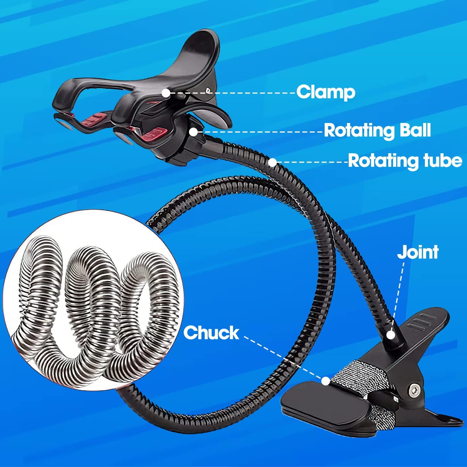 - ✅【Heavy-Duty Base Clamp for Maximum Stability】: Featuring a robust metal base clamp, this mount attaches securely to surfaces up to 2.5 inches thick. Ideal for desks, tables, beds, kitchen countertops, headboards, or even car interiors, the anti-slip spring clamp ensures your device stays steady during use. Note: For heavier phones, it’s recommended to loop the gooseneck for added support and stability.