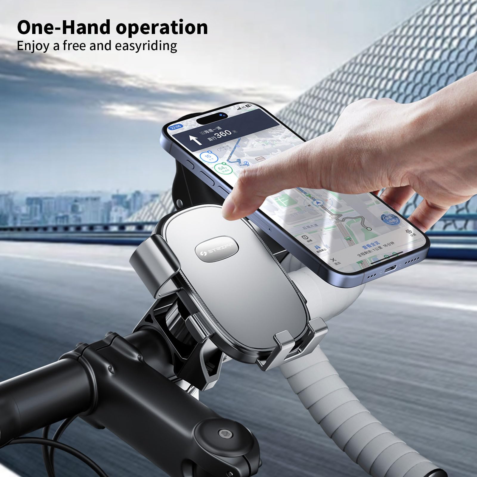 • 【Sturdy and Safe】 The unique design of this mobile mount for bike each corner of your phone tightly, ensuring its safety.STRIFF mobile phone holder for bikes comes with sturdy clamp holds your phone securely and stably, even on bumpy roads, preventing damage or falling