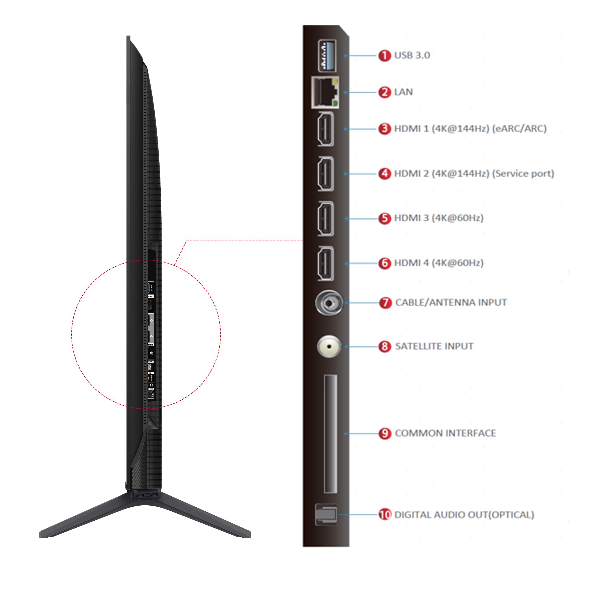 - Connectivity: 3 HDMI Ports | 1 USB port | 1 LAN | 1 Antenna Input | 1 Satellite Input | 1 Digital Audio Out