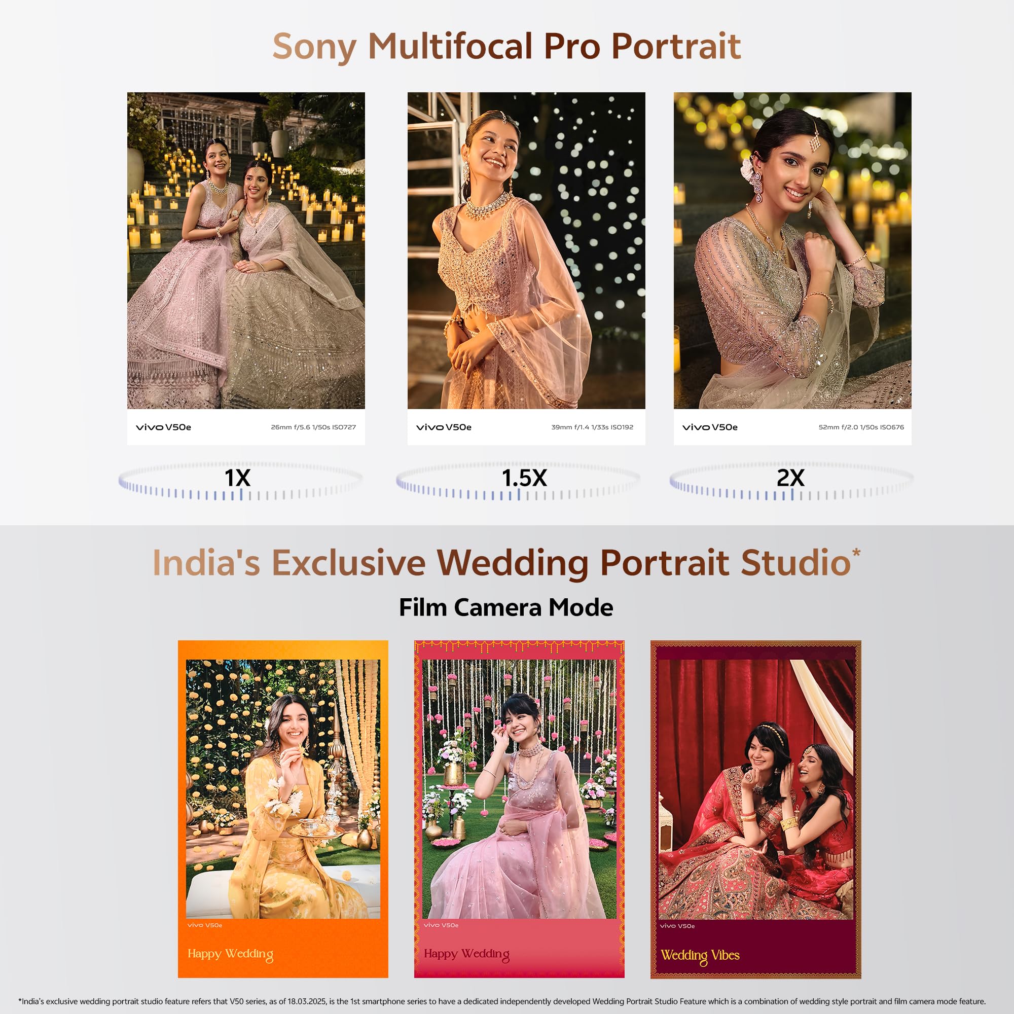 - Rear Camera: Main Camera: 50 MP Auto Focus camera with f/1.79 aperture, , Sony IMX882 Sensor with Ultra-Stable OIS (Optical Image Stabilization) & 2.8 times more light intake to easily capture night scenes (compared to Non-OIS) | India’s Exclusive Wedding Portrait Studio: combination of Wedding-Style Portrait with 3 LUTs & Film Camera Mode | Film Camera Mode: Multiple LUTs combined with multiple frames to create unique compositions | 4K video resolution | 8MP rear wide angle camera with f/2.2 aperture | V50e’s Aura Light intelligently adjust the lighting colour temperature as per ambient conditions | Front Camera: 50MP Eye-AF Group Selfie Camera, aperture f/2.0 | Eye-AF improves detection
