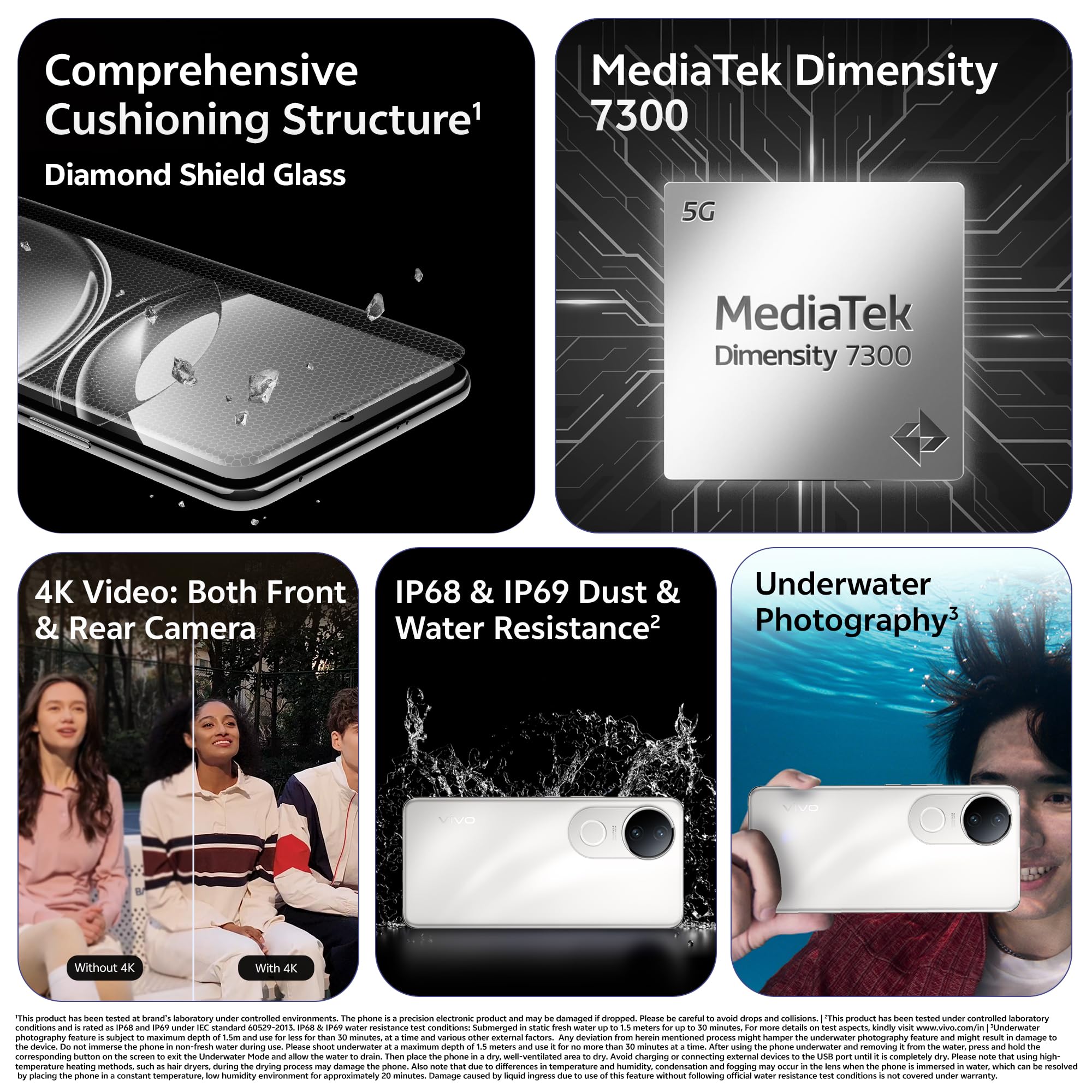 - Durability: V50e comes with IP68 & IP69 Dust & Water Resistance| SGS 5-Star Drop Resistance Certification | Diamond Shield Glass